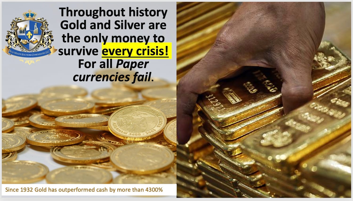 Private physical assets, trust accounts and services offered by Blue wealth solutions consolidated LLC,. are not insured by the FDIC or any other federal government agency, are not deposits or other obligations of, nor guaranteed by any bank or bank affiliate, and are subject to investment risk, *The client’s experience may not be representative of the experience of other clients and is also not indicative of future performance or success.